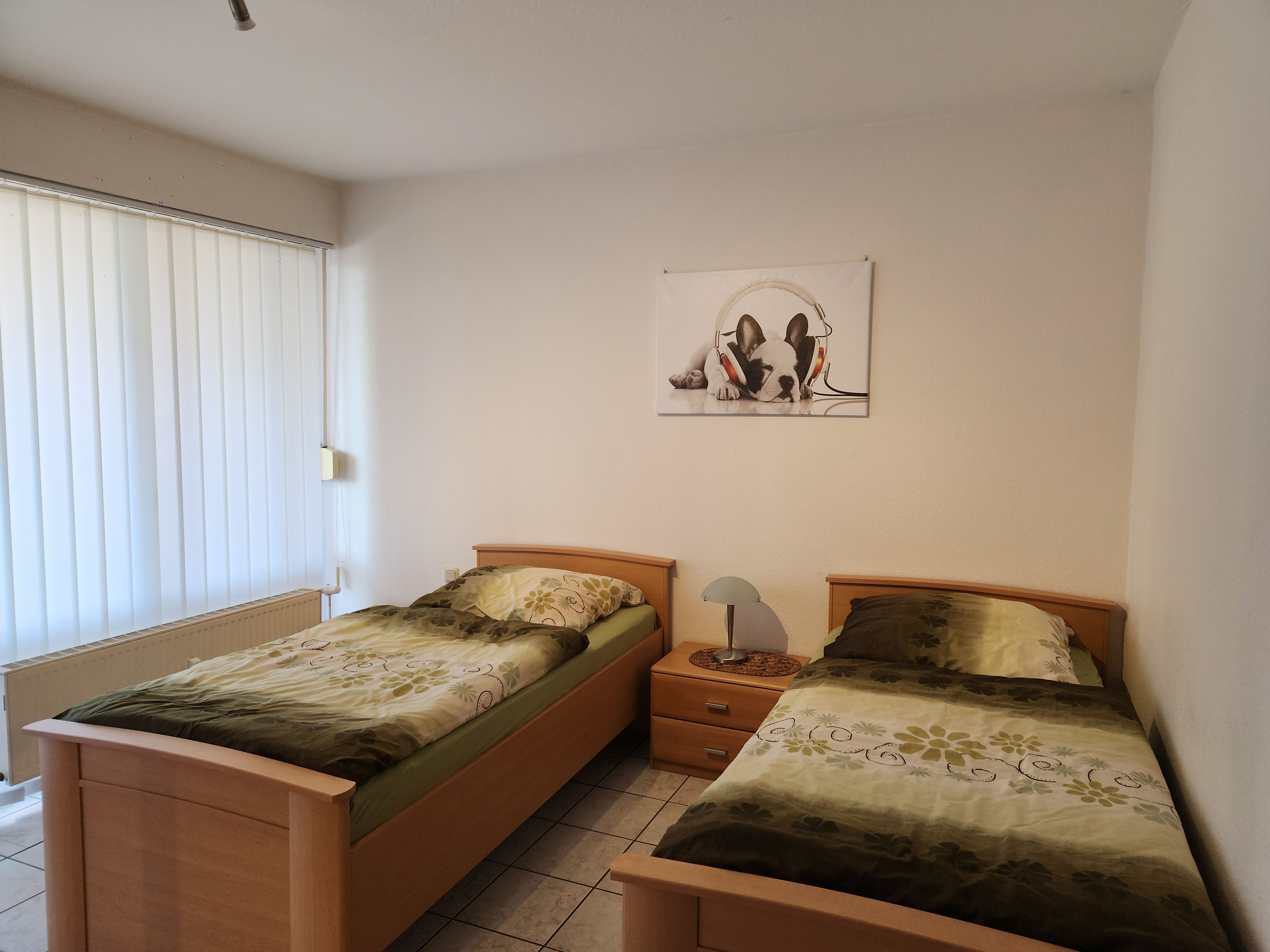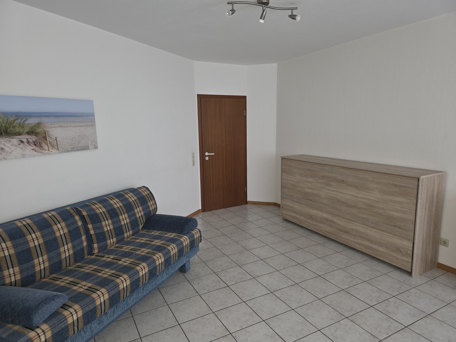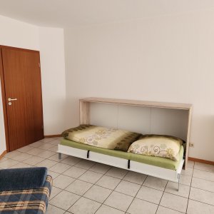 Im Schlafzimmer befinden sich 2 Einzelbetten, ein drittes Einzelbett steht im Wohnzimmerbereich.
